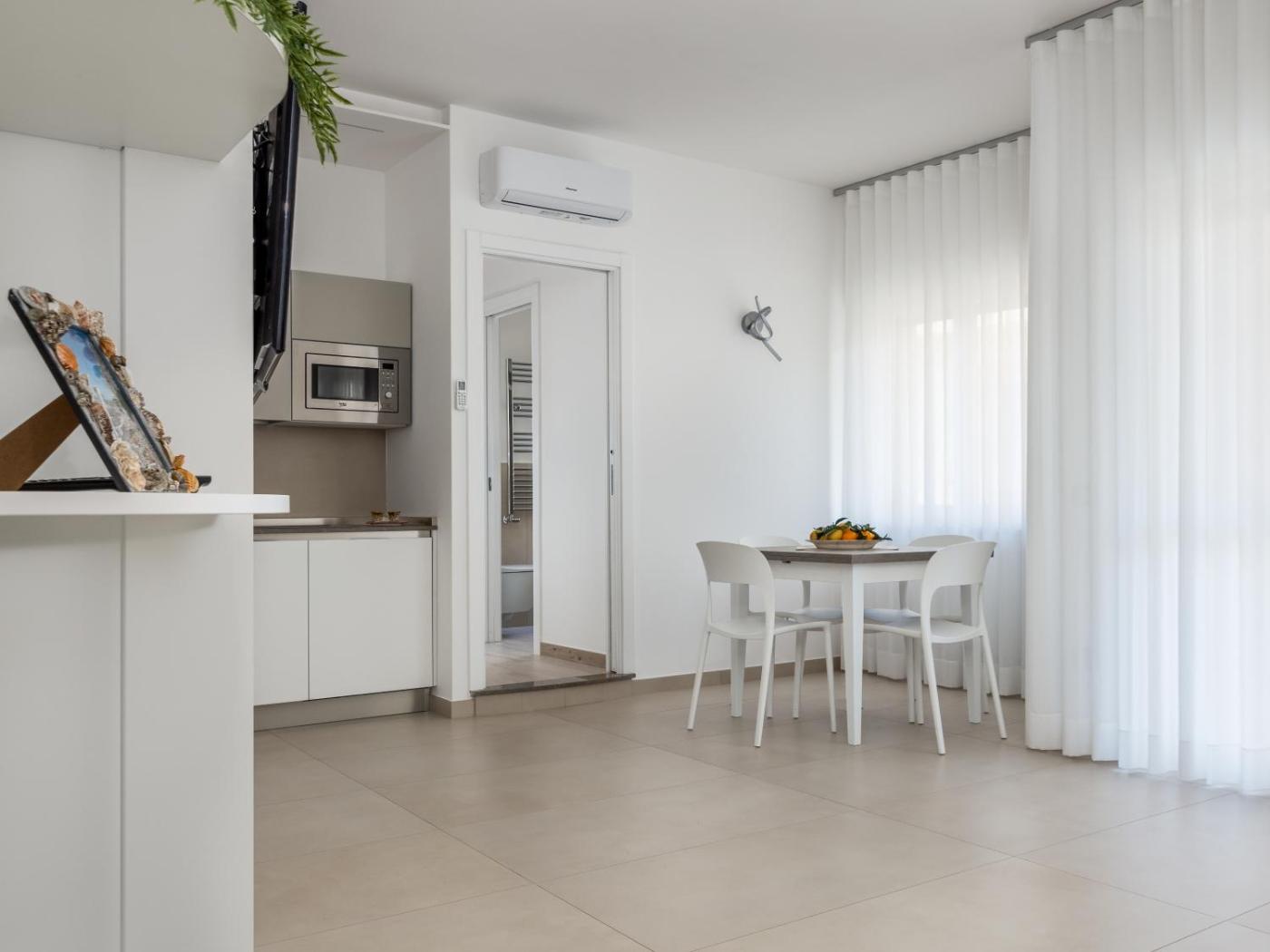 One-Bedroom Apartment. This apartment includes 1 living room, 1 separate bedroom and 1 bathroom with a shower and free toiletries. The fully equipped kitchen has a stovetop, a refrigerator, kitchenware and an oven. The air-conditioned apartment offers a flat-screen TV, a washing machine, a tea and coffee maker, a seating area as well as sea views. The unit has 2 beds.